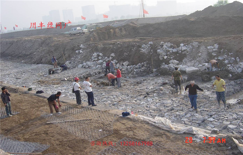 雷諾護(hù)墊是厚度在0.17-0.5m的網(wǎng)箱結(jié)構(gòu),在現(xiàn)場(chǎng)用于裝填石頭。主要用作河道、岸坡、路基邊坡護(hù)坡結(jié)構(gòu)。既可防止河岸遭水流、風(fēng)浪侵襲而破壞,又實(shí)現(xiàn)了水體與坡下土體間的自然對(duì)流交換功能,達(dá)到生態(tài)平衡。坡上植綠可增添景觀、綠化效果。